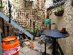 Enclosed COURTYARD with direct access from Tower Street. This is attractively displayed with a paved base, steel fire escape and furniture of posier tables and ornamental tractor seat stools.